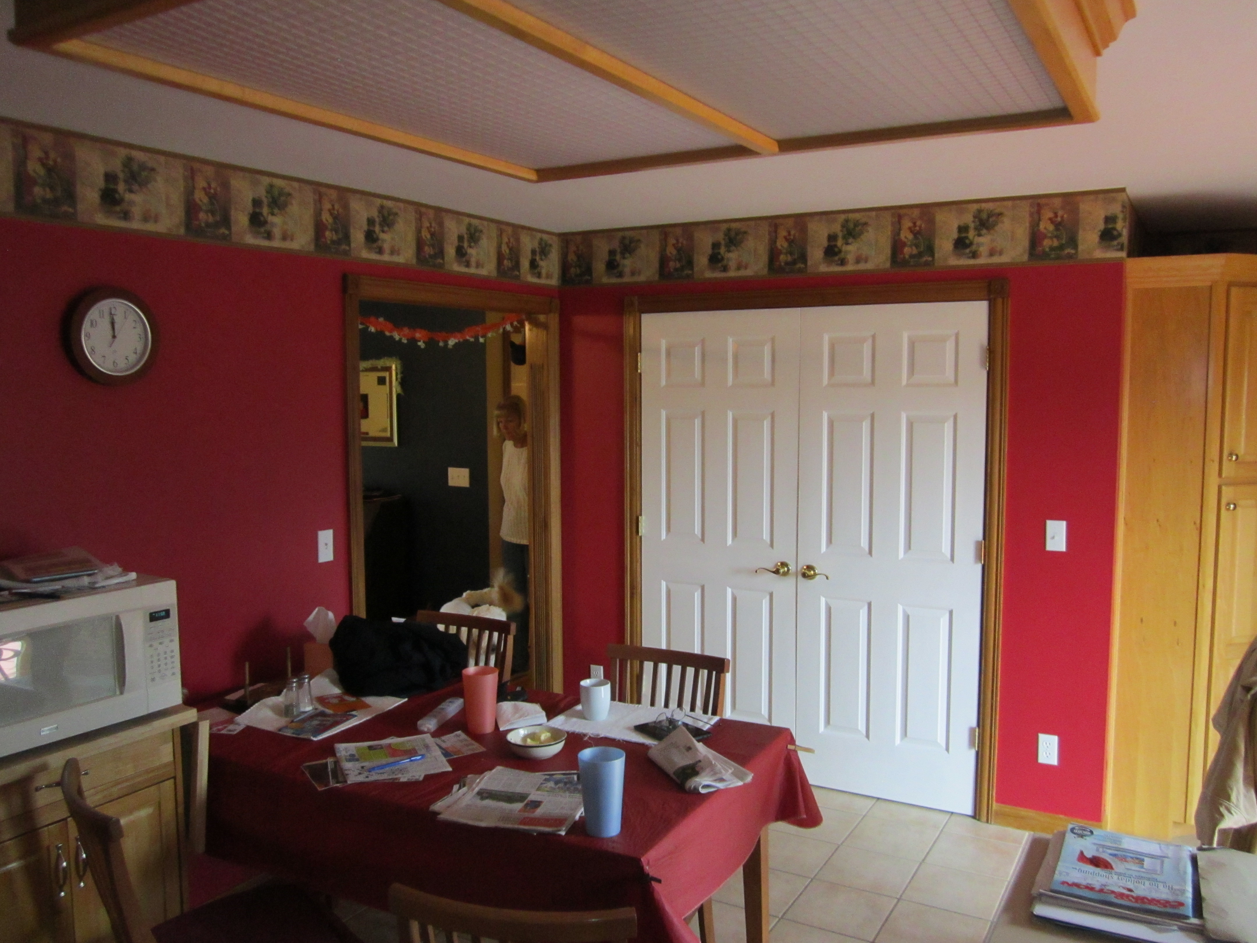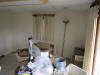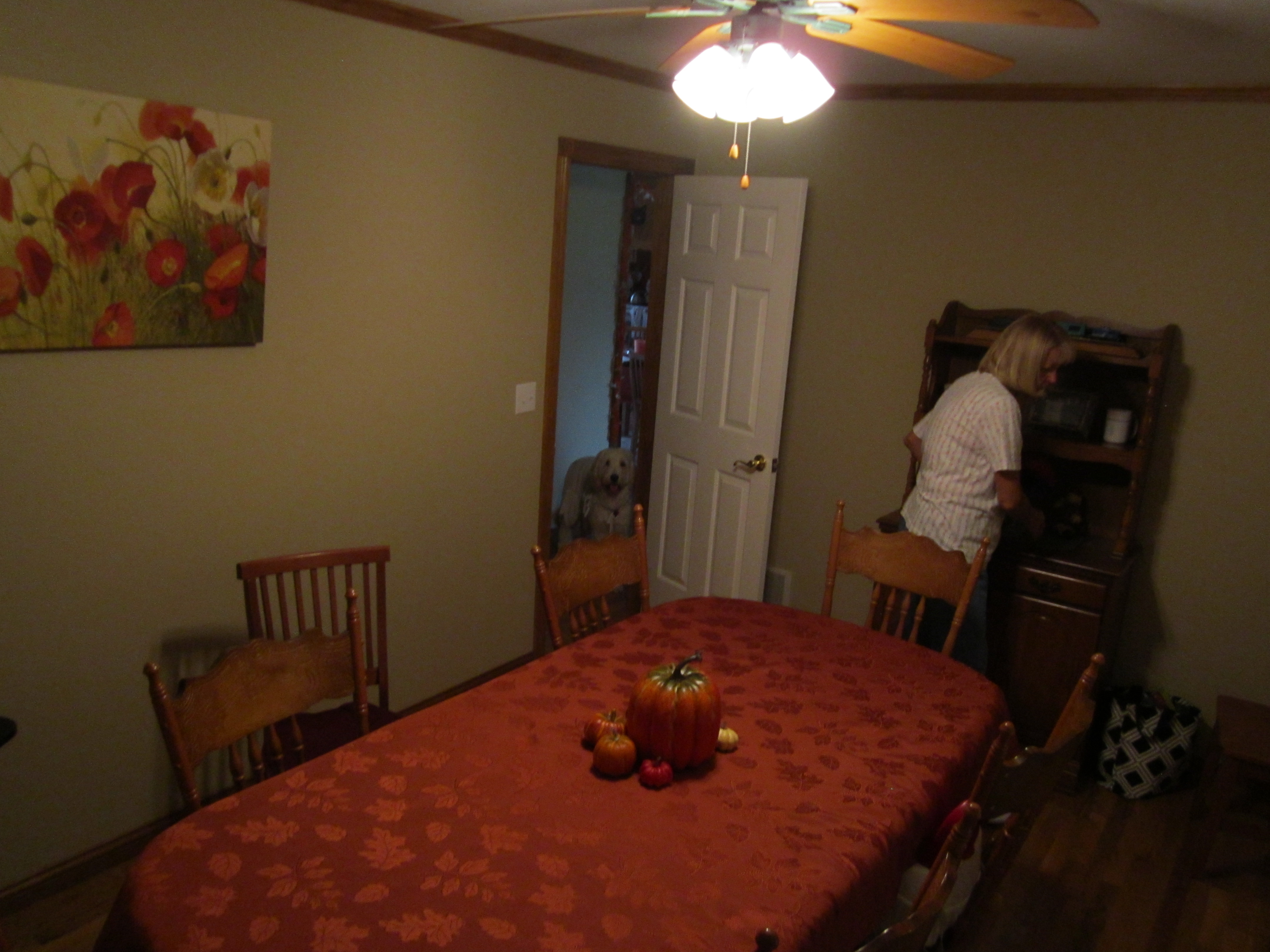 There is no formal dinning room in the house so we took one of the bed rooms and made it into a dinning room. This is Kathy getting things ready for Thanksgiving. And the dog in the doorway keeping track of things. |